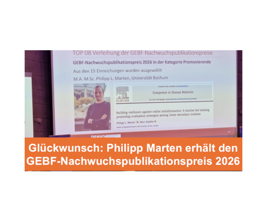 Für den Fachartikel „Building resilience against online misinformation: A teacher-led training promoting evaluation strategies among lower secondary students“ wurde Philipp Marten mit dem Nachwuchspublikationspreis 2026 der Gesellschaft für Empirische Bildungsforschung (GEBF) ausgezeichnet. Der Preis würdigt herausragende Forschungsleistungen, die von Wissenschaftler in einer frühen Karrierephase vor Abschluss ihrer Promotion geleitet wurden.
